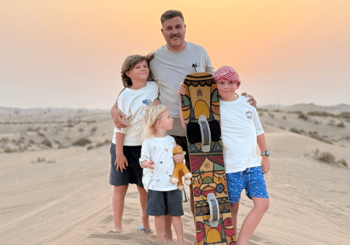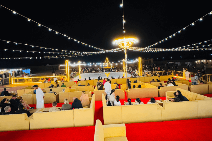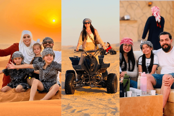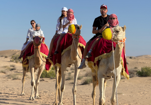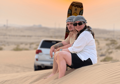 After dune bashing, we’ll stop for refreshments and give you the chance to witness a magical desert sunset — the perfect moment for stunning photos. We then head to our traditional Bedouin-style desert camp, where more cultural and fun activities await. Ride a camel, the “Ship of the Desert,” try sandboarding, and dress up in traditional Arabic attire for memorable photos. Ladies can enjoy elegant henna designs from our skilled henna artist.